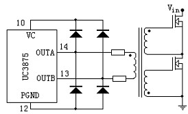 在驅(qū)動小功率的MOSFET和IGBT時,如果控制芯片的驅(qū)動信號是圖騰柱輸出方式,且可提供一定的驅(qū)動電流,那么可以直接由控制芯片來驅(qū)動變壓器,如圖1所示: