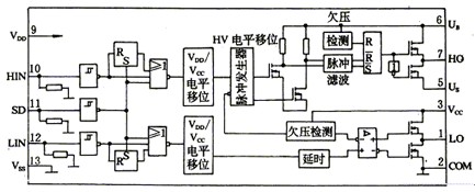 在大功率應(yīng)用場合,由于上述驅(qū)動電路受驅(qū)動能力的限制,無法可靠地驅(qū)動大型MOSFET、IGBT。而集成驅(qū)動器的出現(xiàn)則很好地解決了這一問題。國內(nèi)外已推出了多種具有保護功能的智能驅(qū)動器,如日本產(chǎn)的EXB841、EXB850,國產(chǎn)的M57959和CWK等。它們具有許多優(yōu)點,如電路參數(shù)一致性好、運行穩(wěn)定可靠、具有多種保護功能等。但它們最大的不足是需要單獨的浮地電源,給系統(tǒng)帶來了不便。最近IR公司推出了IR2110集成驅(qū)動器,它針對上述驅(qū)動器電源系統(tǒng)的不足,設(shè)置了自舉浮動電源,只需一路電源即可實現(xiàn)隔離驅(qū)動。對半橋、全橋式電路特別適用。IR2110的功能框圖如圖3所示。