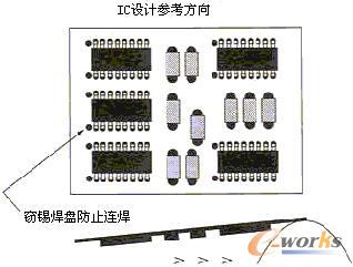PCB上元器件的布局對生產(chǎn)效率和成本有相當(dāng)重要的影響,是衡量PCB設(shè)計(jì)的可裝聯(lián)性的重要指標(biāo)。一般來講,元器件盡可能均勻地、有規(guī)則地、整齊排列,并按相同方向、極性分布排列。有規(guī)則的排列方便檢查,有利于提高貼片/插件速度,均勻分布利于散熱和焊接工藝的優(yōu)化。另一方面,為簡化工藝流程,PCB設(shè)計(jì)者始終都要清楚,在PCB的任一面,只能采用回流焊接和波峰焊接中的一種群焊工藝。這點(diǎn)在組裝密度較大、PCB的焊接面必須分布較多貼片元器件時,尤其值得注意。設(shè)計(jì)者要考慮對焊接面上的貼裝元件使用何種群焊工藝,最為優(yōu)選的是使用貼片固化后的波峰焊工藝,可以同時對元件面上的穿孔器件的引腳進(jìn)行焊接;但波峰焊接貼片元件有相對嚴(yán)格的約束,只能焊接0603及以上尺寸的片式阻容﹑SOT﹑SOIC(引腳間距≥1mm且高度小于2.0mm)。分布在焊接面的元器件,引腳的方向宜垂直于波峰焊接時PCB的傳送方向,以保證元器件兩邊的焊端或引線同時被浸焊,相鄰元件間的排列次序和間距也應(yīng)滿足波峰焊接的要求以避免“遮蔽效應(yīng)”,如圖1。當(dāng)采用波峰焊接SOIC等多腳元件時,應(yīng)于錫流方向最后兩個(每邊各1)焊腳處設(shè)置竊錫焊盤,防止連焊。