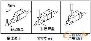 圖6所示為測試點(diǎn)設(shè)計(jì)的一個示例。通過延伸線在元器件引線附近設(shè)置測試焊盤或利用過孔焊盤測試節(jié)點(diǎn),測試節(jié)點(diǎn)嚴(yán)禁選在元器件的焊點(diǎn)上,這種測試可能使虛焊節(jié)點(diǎn)在探針壓力作用下擠壓到理想位置,從而使虛焊故障被掩蓋,發(fā)生所謂的“故障遮蔽效應(yīng)”。由于探針因定位誤差引起的偏晃,可能使探針直接作用于元器件的端點(diǎn)或引腳上而造成元器件損壞。