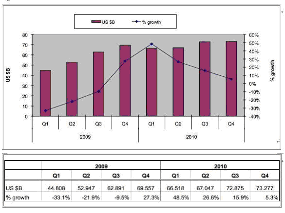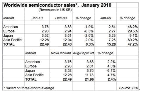 按SIA總裁的看法,全球半導體銷售額1月的最新數據(三個月的移動平均值) 比12月的225億美元上升0,3%,分析推動市場增長在眾多方面,包括計算機,手機,汽車電子和工業應用。如果與去年同期相比,銷售額增長達47%,顯然與09年1月時正值全球的最低點有關。
