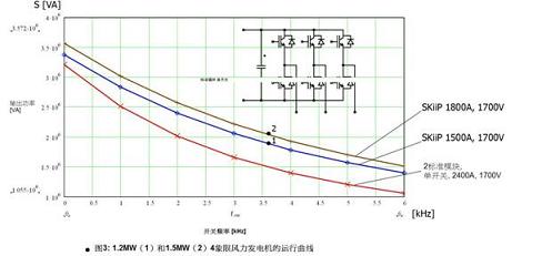 兩個單管模塊將提供一個2.4kA的半橋。比較計算的結(jié)果可以看到,與放置在最大外殼中的標(biāo)準(zhǔn)模塊相比,采用SKiiP的方案可在整個開關(guān)頻率范圍內(nèi)提供更高的輸出電流。可用逆變器輸出功率與開關(guān)頻率的關(guān)系見圖3。
