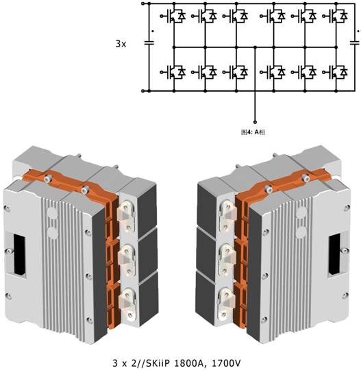 如果采用了更強大的SKiiP模塊,如使用氮化鋁作為陶瓷基板的SKiiP1.8kA,1.7kV,可從三相逆變器獲得更高的功率,即1800kVA。