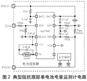 阻抗跟蹤鋰離子單節電池組電路如圖2所示。通過BAT2引腳輸入端測量電池電壓,通過庫侖計數器差動信號輸入端(SRP及SRN)監測電流。系統利用電量監測計從單線SDQ通信端口獲得SOC及運行時間接近結束(Run-Time-to-Empty)等信息。