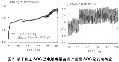 即使在負載變化的情況下,IT電量監測計也能正確預測電池的剩余電量。例如,數碼相機處于不同工作模式時,電池的負載也不同。圖3顯示了IT電量監測計如何精確預測電池剩余電量。剩余電量預測的誤差率可小于1%。并且,由于用以預測剩余電量的電池阻抗及老化作用能夠得到實時更新,故在電池整個使用壽命內均可保持這種微小誤差。
