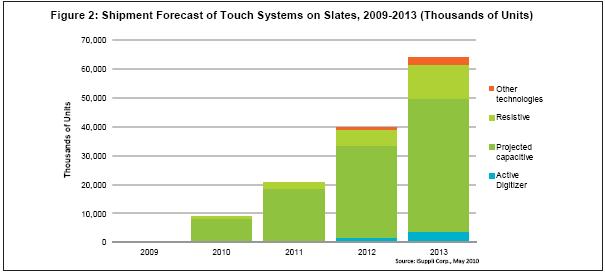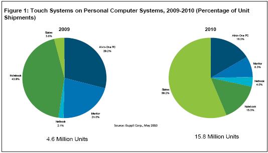 最近幾年,個(gè)人電腦市場(chǎng)對(duì)于觸摸屏的需求不斷增長(zhǎng),2008和2009年增長(zhǎng)率超過(guò)20%,快于總體系統(tǒng)市場(chǎng)。但與該市場(chǎng)2010年462%的增長(zhǎng)率相比,上述增長(zhǎng)速度就相形見(jiàn)絀了。平板觸摸電腦是PC觸摸革命中的主要初期推動(dòng)者,預(yù)計(jì)占PC觸摸市場(chǎng)的比例將從2009年的3.8%銳升到56.2%,而總體PC觸摸市場(chǎng)規(guī)模將擴(kuò)大兩倍。
