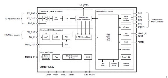 AMIS-49587符合IEC1334標準,有助于簡化設計、降低開發及應用成本,并加速上市進程。該器件基于ARM7TDMI處理器內核,包含物理接口收發器(PHY)和媒體訪問控制器(MAC)層,而大多數競爭方案都需要復雜的嵌入式軟件來執行與AMIS-49587相同的功能。該器件采用擴頻型移頻鍵控(S-FSK)調制技術,結合精確的濾波,為長距離電力線提供可靠的低數據率通信,以及2,400 bps(波特)的半雙工可調節通信速率。不到20千赫(kHz)的低工作頻率配以自動中繼器(repeater)功能,令通信更可靠,通信誤差比其他及現有方案更低。圖3是AMIS-49587的方框圖。