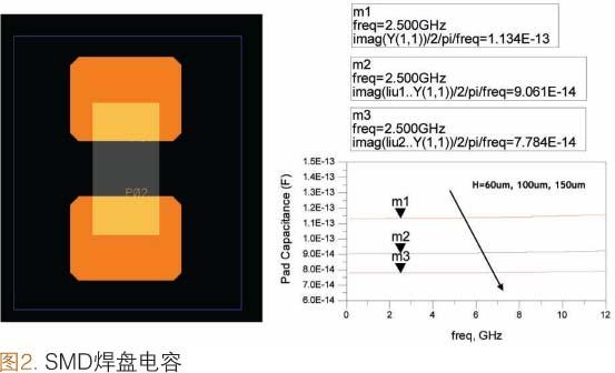 電路原理圖和與其相對應的實際電路之間的主要差異在于,實際電路/布線中表示出了連接和支撐SMD的互連和焊盤(附加部分)。在RF頻率下(如2.5GHz),這些附加部分可能對電容產生“失調”作用,這種作用不容忽視。圖2給出了這種現象的實例。0201元件的焊盤位于頂層(M1),它比本征0201占用面積稍大,從而保證較高的組裝成品率。第二層(M2)通常為固體接地平面層,M1和M2之間是介質層,其厚度值具有一定的范圍要求。當介質層厚度從150.0μm向100.0μm和60.0μm轉變時,焊盤電容從77.8fF向90.6fF和113.0fF轉變。如果把這些焊盤用于1.0pFSMD電容,包括焊盤電容在內的整體電容值將增大11.3%(使用60.0μm介質),這個增大后的電容足以對RF電路的功能起到微調作用。