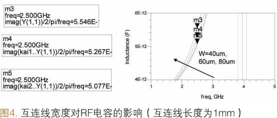 除互連線長度之外,互連線的寬度也會對RF電容產生影響。在襯底的制作過程中,線寬通常會發生變化(舉例來說,與設計寬度相比,實際線寬的變化范圍為±10.0μm~±15.0μm)。如圖4所示,如果設計的互連線為1.0mm長,60.0μm寬,實際卻達到40.0μm寬,在2.5GHz下等效電容變化將達到5.3%(以3.0pF接地SMD電容為例)。如果把這種SMD電容用于濾波器中,對于RF應用來說,電容值5.3%的變化將導致約2.7%的頻移。我們必須對RF應用中含有SMD電容的RFSiP模塊的襯底制造容差進行細致研究。