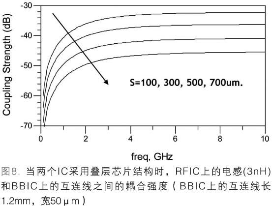 圖8表示了BBIC和RFIC電感之間的耦合強度(未使用隔離層)。假設BBIC和RFIC的厚度為250.0μm時,對VCO電路中的3nH電感進行了研究。BBIC中主時鐘的互連線設置為1.2mm長。根據模擬結果,當橫向距離(S)為100.0μm時,2.5GHz下的隔離為-35dB。這一隔離值對大多數RF應用來說是不夠的。當橫向距離為700.0μm時,隔離值提高為-50dB,這個值對大多數RF應用來說仍然不夠。為保證VCO電感的性能,位于BBIC電感上方的主時鐘不能使用長互連線。根據以上分析,我們還應對RFSiP使用的疊層芯片法做進一步研究,從而判斷BBIC和RFIC器件之間出現嚴重相互干擾的可能性。