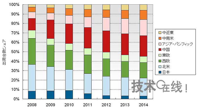 出處:DisplaySearch“中國TV市場調查報告2010年版” 中國市場作為全球電視市場的消費地的地位將會進一步提高。2011年液晶電視供貨量將超過北美,2012年平板電視需求將超過5000萬臺(圖1)。