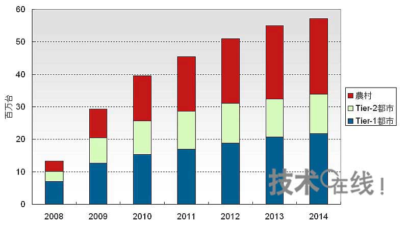 由于中國的城市人口不斷增加,2014年將超過中國人口的一半,達到56%,較10年前增長14%。我們首次將中國的液晶電視需求按照“一線城市”、“二線城市”及“農村”的劃分進行了預測。在農村,目前正在由顯像管電視向平板電視過渡,一線城市和二線城市每戶家庭擁有的電視數量將增加。根據經濟的增長程度,電視需求甚至有望超出預測。我們預測,2014年中國液晶電視需求中,城市約占60%,增長至3400萬臺左右(圖2)。