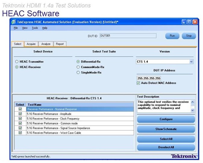 泰克的測試解決方案不僅Type D(移動HDMI)和Type E(車用HDMI)新興應用通吃之外(無需硬件仿真器,并且相關夾具產品都通過了CTS1.4的批準),而且還能實現驗證HDMI 以太網和音頻回傳通道(HEAC) 、3D HDMI強制格式、4K x 2K 和新的色彩空間格式。HEAC的物理層測試包括以太網發送、接收測試;音頻發送、接收測試;以及設備阻抗測試和線纜測試。同樣是通過軟硬件結合進行模擬的方法使得用戶無需投資購買更多測試儀,只要購買相應夾具,可在原有示波器、信號發生器的基礎上進行配置,可產生真正的HEAC信號。