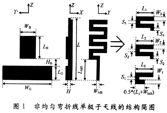 非均勻彎折線的單極子天線結(jié)構(gòu)如圖1所示。基板選用Rogers4350B基板,厚度為0.762mm,相對(duì)介電常數(shù)為3.48。為了分析方便,將輻射元分成了3段;天線的饋電采用了50Ω的微帶線。