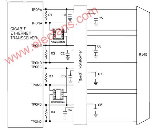 Semtech公司的RClamp2504N/3304N已被成功地應(yīng)用在電腦的RJ45連接器里,它具有較低的鉗位電壓,電容和工作電壓,這樣可以保護(hù)一些敏感的物理層的芯片。該解決方案將非常好,成本低,加上好的RJ45連接器結(jié)構(gòu)和PCB設(shè)計給線對地保護(hù)。