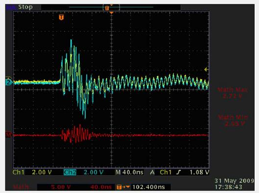 基本上,由于客戶有好的連接器結(jié)構(gòu)和PCB設(shè)計,當(dāng)雷擊發(fā)生時,它能通過結(jié)構(gòu)和PCB設(shè)計釋放,從這個+6KV雷擊測試結(jié)果看,我們發(fā)現(xiàn)波形看起來像振鈴,在PHY端鉗位電壓非常低,這說明大部分雷擊能量已被釋放,這時能很好的保護(hù)PHY芯片。
