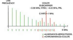 在最初的開發(fā)階段,電視機(jī)僅支持單色(即黑白)圖像的播放和顯示。隨著技術(shù)的發(fā)展,也支持彩色電視廣播,但仍然需要保持黑白電視顯示設(shè)備的向后兼容性。電視機(jī)需要在可用帶寬范圍內(nèi)容納顏色信息,并如同早期電視那樣的格式繼續(xù)顯示無失真的黑白畫面。