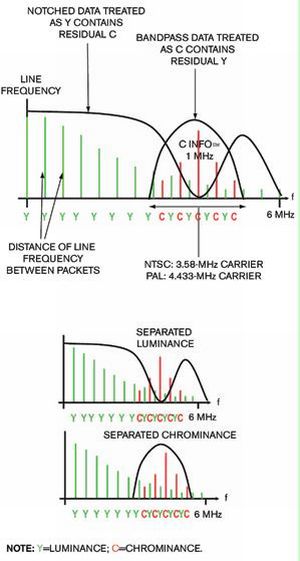 色度信息置于頻譜的高端,為線路長(zhǎng)度的倍數(shù)。顯示方面的難題在于如何正確地提取亮度信息和色度信息,以及如何在未造成顯示偽像的情況下保持全帶寬。
