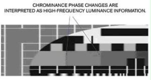 如果沒有發(fā)生亮度-色度分離,載波正循環(huán)或反循環(huán)時(shí),顏色信息使畫面更亮或更暗。同時(shí)顏色信息也會(huì)錯(cuò)誤地出現(xiàn)在圖像的黑白部分(圖2)。