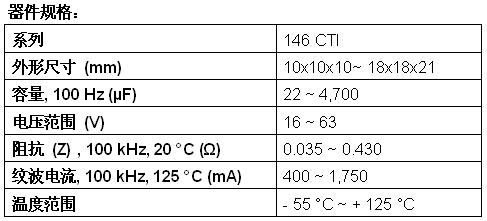 新款146 CTI電容器具有最苛刻的回流焊曲線(xiàn),提供從10mmx10mmx10mm至更大的18mmx18mmx21mm的8種外形尺寸。今天發(fā)布的器件的高溫性能達(dá)+125℃,在100kHz和+20℃條件下的阻抗為0.035Ω~0.430Ω,在100kHz和+125℃條件下的紋波電流為400mA~1750mA,在+125℃下的使用壽命長(zhǎng)達(dá)6000小時(shí)。