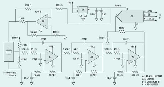 ADC121S021是一款設有串行外圍接口(SPI)的12位、200kSPS單端輸入轉換器。型號為LM4140ACM-4.1的另一款高精度電壓參考電路可為這款模擬/數字轉換器提供電壓參考,并為濾波放大器提供偏壓,并設置濾波器的偏置電壓為模擬/數字轉換器輸入電壓范圍的一半。傳感器的輸出屬于交流電信號,而中度的電平偏移可將信號轉移到模擬/數字轉換器輸入電壓范圍內的中央位置。LM4140芯片也可為LM730132V通用放大器(即A4放大器)所輸出的壓控電流提供電壓參考。傳感器內置的MOSFET可為壓電傳感電路提供緩沖。A4放大器負責輸出電流,以便驅動組成為共源級放大器的MOSFET,而有關晶體管則通過交流耦合與輸出終端裝置連接在一起。