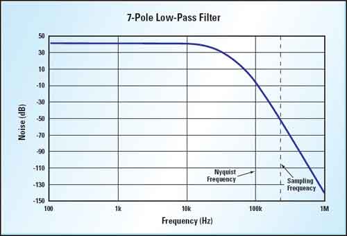 我們最好采用125倍的增益,以便多留一點余量。以40kHz這個最高信號頻率為例,取樣率便成為一個令人擔憂的問題。為免高于尼奎斯特頻率的混疊信號頻率,我們必須將取樣頻率的一半加以濾波,然后將振幅抑制至模擬/數字轉換器的1LSB以下。在這個例子中,我們所采用的是12位的模擬/數字轉換器,其參考電壓為4.096V,將得到1mV解析度,計算方法如下: