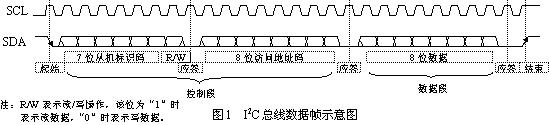 如圖1所示是常見的I2C總線上傳輸?shù)囊蛔止?jié)數(shù)據(jù)的數(shù)據(jù)幀,其總線形式是由數(shù)據(jù)線SDA和時鐘SCL構成的雙線制串行總線,并接在總線上的電路模塊即可作為發(fā)送器(主機)又可作為接收器(從機)。幀數(shù)據(jù)中除了控制碼(包括從機標識碼和訪問地址碼)與數(shù)據(jù)碼外還包括起始信號、結束信號和應答信號[4]。