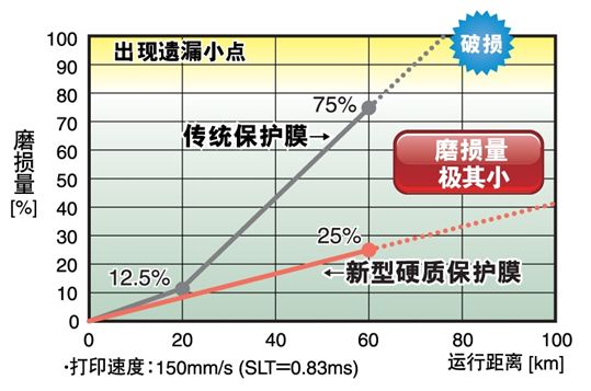 為了應對這種情況,采取了將打印頭的保護膜材料變更為硬質材料等對策,但提高保護膜的強度的課題是保護膜的組成和發熱部分的形狀設計。在以往的產品中,使用某些劣質熱敏紙時,使用壽命僅10km左右,這當然與打印機的使用頻率也有關系,但發生過幾個月左右就無法使用的案例。羅姆面對這種情況,一直致力于改善保護膜材料中的硬質材料的結構和打印頭結構。這次開發的熱敏打印頭通過優化保護膜材料的構成物質及其組成,大幅提高了耐磨性,實現了比以往產品高約3倍的耐久性(保證150km(以往產品是50km))。另外,通過提高保護膜的熱導率,打印效率也比以往改善了15%,同時還提高了打印質量。而且,這種打印頭的形狀保持與以往產品完全相同,因此無需進行打印機的設計變更,另外,這種規格還可以用于修補替換。