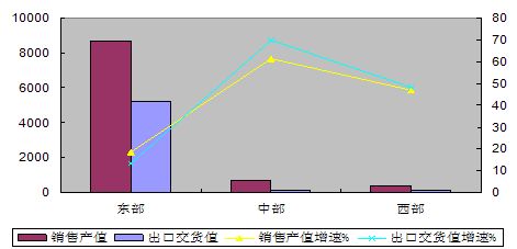 西部地區(qū)銷售產(chǎn)值和出口交貨值分別增長46.9%和48%,出口高出行業(yè)平均水平25.3和33.2個(gè)百分點(diǎn)。四川、重慶正逐步成為行業(yè)新的增長極,銷售產(chǎn)值分別增長45%和162.5%。
