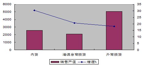 三資企業(yè)實(shí)現(xiàn)銷售產(chǎn)值7132億元,增長18.7%;出口交貨值4932億元,增長14.4%,分別低于行業(yè)平均水平2.9和0.4個(gè)百分點(diǎn)。其中港澳臺(tái)企業(yè)銷售產(chǎn)值增長20.7%,外商投資企業(yè)增長18.0%。
