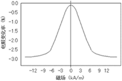 AMR單體是用鎳和鐵等制成的強磁性金屬合金。一般采用硅(Si)制成,當遇到施加的電流方向垂直的磁場時,阻抗值發生變化。這個現象就稱為磁阻效應,特性如圖1所示。它以0(零)H為軸,正負兩側對稱的特性,因此是不區別磁鐵的N極和S極的兩極檢測。