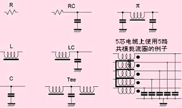低頻模擬信號中使用的濾波器,尤其是當電子電路的靈敏度非常高時,需要采用如電源線濾波器一樣的單級或多級電路。然而,在多數情況下,信號是數字化的或高電平模擬信號,對干擾不很敏感,因此可采用R、L、C、RC、LC、T、或π型濾波器,如圖4所示。
