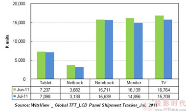 據市調機構WitsView公布最新7月份大面板出貨調查報告,2011年7月份大尺寸面板出貨量為5,643萬片,較6月份減少5.2%,較去年同期成長11%。WitsView預估,第3季出貨季增率只有1%至3%,出貨表現旺季不旺,季增率將是史上第3差。
