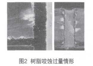 可見,產生CAF必須具備下列五種條件:裸露的銅導體、水氣、電解質、電位差和通道。前四項在電子產品的使用中不可避免。通道是唯一可控制產生CAF的途徑,而通道的形成主要與印制板的生產過程中材料、鉆孔、去沾污等因素相關。一般地來說材料的玻纖越細,樹脂含量越高,韌性越好,鉆孔撕裂的機率較低,因此,對于高密度的印制板或潮濕環境中使用的印制板盡可能采用細玻纖的材料。不同的材質的鉆頭,不同鉆孔數量,不同的鉆孔參數,鉆孔時,鉆頭對增強材料的沖擊不同,孔壁質量的差異較大,對孔壁的損傷也不盡一致,芯吸程度不一。因此,為了杜絕通道的發生,應當嚴格控制鉆孔質量,確保孔壁光滑平整。去沾污主要目的是去除內層導體鉆孔時吸附樹脂,當然,也咬蝕孔壁絕緣層中的樹脂,有時為了形成負凹蝕,孔壁絕緣層樹脂甚至咬蝕更多。這時,咬蝕量需嚴格控制。否則,極易形成“通道” 。如下圖樹脂咬蝕過量情形。