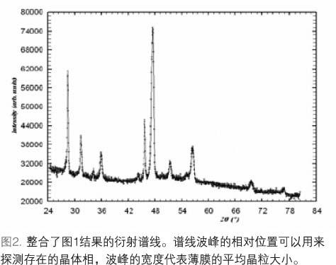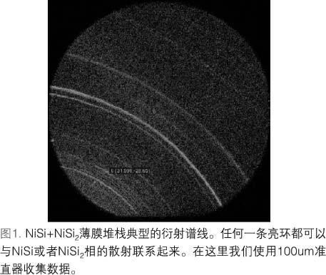 相分析要求事先了解感興趣的相。一種自動化的峰擬合算法用來獲得曲線中每一個峰的位置和強度值。將實驗峰值的位置與感興趣相的譜線作對比,來確定該相是否存在。另外,曲線中不能被匹配的峰意味著更多的相存在。例如在圖2中,如果取樣程式認(rèn)為在測量的硅片上只存在鎳單硅化物,盡管事實上相的鑒定需要手工完成,但多余的峰(來自于NiSi2)仍然會被軟件標(biāo)記。為了測量不同相的比例,一種針對多相系統(tǒng)的應(yīng)用遵循了這樣的原理,即一個獨立相衍射峰的強度(一級近似)與薄膜中對應(yīng)相的數(shù)量成比例。