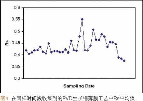 這種設(shè)備最初的一種應(yīng)用是監(jiān)測一系列物理氣相淀積(PVD)的反應(yīng)腔,這些反應(yīng)腔在銅互連金屬化制程中被用來淀積TaN/Ta/Cu襯墊層和籽晶層。這種監(jiān)測作為標(biāo)準(zhǔn)的平面電阻,膜厚量測的補充而存在。薄膜堆棧中Ta和Cu成分的織構(gòu)強度和譜線展寬數(shù)據(jù)都需要收集。TaN層具有無定形結(jié)構(gòu),因此無法監(jiān)測。圖3說明了一個從銅元素峰寬控制圖表中輸出的例子。數(shù)據(jù)的趨勢穩(wěn)步向上,表明PVD銅籽晶的平均晶粒大小隨著時間在減小。圖4說明了在相應(yīng)的Rs圖表中類似但并不十分顯著的增加。隨后的設(shè)備診斷發(fā)現(xiàn)受影響的反應(yīng)腔一個閥門有空氣泄漏的現(xiàn)象。泄漏影響到濺射工藝,進(jìn)而影響銅籽晶層的淀積,這一過程極有可能是在淀積和淀積之后的自退火過程中,由于銅在Ta表面的遷移率下降造成。更換了閥門之后,Rs和銅元素峰寬的值都變小,我們從圖3和圖4控制圖表中的最后三個數(shù)據(jù)點可以看出。