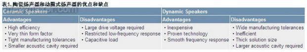 如今的便攜式設(shè)備需要更小、更薄、更省電的電子元器件。對(duì)于設(shè)計(jì)小巧的手機(jī),動(dòng)圈式揚(yáng)聲器成為了制造商能否生產(chǎn)出超薄手機(jī)的制約因素。在這一需求的推動(dòng)下,陶瓷或壓電揚(yáng)聲器迅速興起,成為動(dòng)圈式揚(yáng)聲器的替代方案。陶瓷揚(yáng)聲器能以超薄、緊湊的封裝提供極具競(jìng)爭(zhēng)力的聲壓電平(SPL),具有取代傳統(tǒng)的動(dòng)圈式揚(yáng)聲器的巨大潛力。動(dòng)圈式揚(yáng)聲器和陶瓷揚(yáng)聲器的區(qū)別如表1所示。