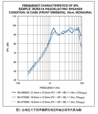 陶瓷揚(yáng)聲器制造商通常規(guī)定了揚(yáng)聲器的最大驅(qū)動(dòng)電壓,典型值15VP-P。電壓最大時(shí)陶瓷器件的偏移量達(dá)到極限。外加電壓大于額定電壓時(shí)不會(huì)導(dǎo)致聲壓升高,反而增加了輸出信號(hào)的失真度。圖3為電壓最大時(shí),陶瓷揚(yáng)聲器輸出聲壓(SPL)與頻率的關(guān)系曲線。通過對(duì)比SPL與頻率的關(guān)系曲線圖以及阻抗與頻率的關(guān)系曲線圖,可以明顯看出壓電揚(yáng)聲器產(chǎn)生高SPL時(shí),在自激頻率處效率最高。