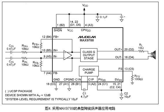 圖4中的MAX9788采用一個(gè)片上電荷泵產(chǎn)生與VDD相反的負(fù)電源電壓。當(dāng)輸出信號(hào)需要高壓驅(qū)動(dòng)時(shí),負(fù)電源電壓作用于輸出級(jí)。MAX9788提供了一種驅(qū)動(dòng)陶瓷揚(yáng)聲器的優(yōu)化方案,比采用AB類放大器和升壓轉(zhuǎn)換器的傳統(tǒng)方案更高效。
