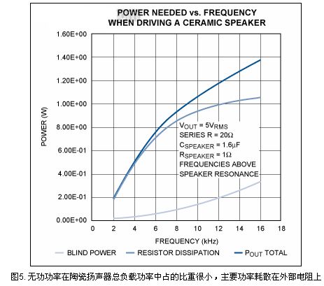 驅(qū)動(dòng)10Ω串聯(lián)電阻的陶瓷揚(yáng)聲器時(shí),總負(fù)載功率中無(wú)功功率占的比重并不大。大部分功率耗散在外部電阻上,圖5為放大器功率與頻率的關(guān)系曲線。