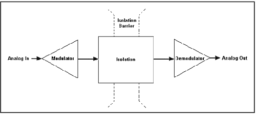 在一個理想的隔離放大器中,其模擬輸出信號與模擬輸入信號完全相同。圖7中標記為“隔離”的部分采用了之前章節中討論的技術(光耦合、電容耦合或感應耦合)之一,以跨過隔離層傳遞信號。調制器電路為隔離電路對信號進行預處理。對于光學耦合方法,您需要對該信號作量化處理,或將其轉換為變化的光強。對于電容耦合方法和感應耦合方法,您需要將該信號轉換為變化的電場或磁場。然后,解調器電路讀入隔離電路的輸出,并將其轉化回最初的模擬信號。