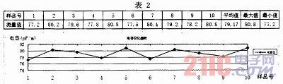 利用同軸電纜芯線電容測量裝置,測量型號為50-5芯線,各時段樣品的測量結果及變化曲線見表2。只要在數據表(電子版)中輸入數據,就會自動繪制曲線。該圖表可以監視芯線電容的變化情況。
