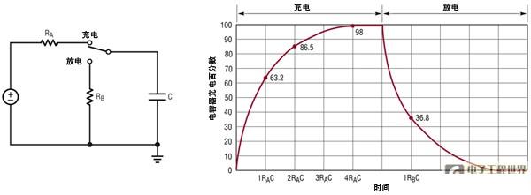 也許最簡(jiǎn)單、最常見(jiàn)的電子電路是電阻器和電容器串聯(lián)后連接到地所形成的電路。如圖 1 所示,當(dāng)電壓加在電阻器上時(shí),電容器上的電壓響應(yīng)會(huì)呈現(xiàn)指數(shù)規(guī)律:VC = VR (1-e-t/),當(dāng)電阻器接地時(shí),電容器上的電壓響應(yīng)會(huì)呈現(xiàn)類(lèi)似但反向的指數(shù)規(guī)律:VC = VINITIAL(e-t/)。這種簡(jiǎn)單和可預(yù)測(cè)的時(shí)間響應(yīng)使這種電路成為濾除噪聲、降低快速信號(hào)邊沿速度、保護(hù)設(shè)備輸入、避免競(jìng)態(tài)情況以及解決其他無(wú)數(shù)定時(shí)問(wèn)題的理想解決方案。即使沒(méi)有給電路添加電阻器或電容器,由于走線(xiàn)或連線(xiàn)中的電阻,這種電路實(shí)際上也常常存在。