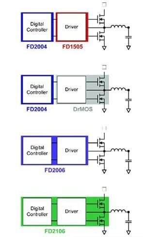 FD2004可以與外部柵極驅(qū)動(dòng)器 (如FD1505) 和分立式MOSFET ,或是集成了驅(qū)動(dòng)器與MOSFET的單封裝DrMOS產(chǎn)品協(xié)同工作。它還可以在獨(dú)立式應(yīng)用中通過(guò)電阻 來(lái)編程—特別地,輸出電壓的最大值由電阻設(shè)定,且利用軟件命令設(shè)定的電壓最大值不得超過(guò)10%以上,以保護(hù)負(fù)載。在需要較大電流的應(yīng)用中,如多相轉(zhuǎn)換器,所選的架構(gòu)可實(shí)現(xiàn)多達(dá)8個(gè)相位的電流共享,而且可在輸出功率較低時(shí)實(shí)現(xiàn)切相 (phase shedding) 來(lái)保持高效率。該款控制器基于帶自適應(yīng)性能算法和環(huán)路補(bǔ)償?shù)臄?shù)字控制環(huán)路,支持高達(dá)1.4MHz的開(kāi)關(guān)頻率。時(shí)鐘同步可協(xié)助提升EMI性能。對(duì)于同時(shí)需要集成式驅(qū)動(dòng)器和分立式外部MOSFET的應(yīng)用,FD2006也是個(gè)不錯(cuò)的選擇。