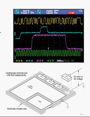 THS3000系列產品型號分為帶寬100 MHz、最大采樣率2.5 GS/s和200 MHZ、5 GS/s兩種,性能達到同類最佳。具備四個隔離通道,每通道10,000個樣點的記錄長度使用戶能夠以高采樣率捕獲大量信號信息,從而清楚地看到信號細節(jié),快速發(fā)現(xiàn)信號異常。THS3000示波器上的各個通道與機身接地以及各通道相互之間是隔離的。另外,用于數(shù)據存儲、儀器設置和PC通信的外部USB輸入也是隔離的。這讓用戶能夠安全地使用隨附的10X探頭進行電壓高達300 VRMSCAT III的浮動測量,或使用可選探頭進行電壓高達1000 VRMSCAT II的浮動測量。該儀器具有600 VRMSCAT III 防護等級的輸入(BNC連接器至大地),以保證安全的高壓測量。