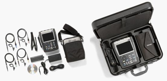 手持示波器經常用于進行電機驅動器、功率變換器/逆變器和功率半導體器件的功率測量。通過結合使用泰克的廣泛電壓和電流探頭,THS3000系列手持示波器可進行這些測量。其四個輸入通道中的每個通道均可進行配置,以匹配探頭類型和衰減系數(shù),確保正確的測量和光標讀數(shù)。該產品標配4個新型的 300 MHz CAT III 安全等級探頭,也標配了OpenChoice軟件,像以前使用泰克臺式示波器一樣方便。圖4中左圖為THS3000系列標準機型配件,包括 4 個探頭、電池、電源適配器和電源線、OpenChoice CD、校準證書、系帶和軟提箱。圖4中右圖為TK 機型配件,包括4 個探頭、電池、電池適配器和電源線、 OpenChoice CD、校準證書、系帶、探頭配件包、探頭盒和硬提箱。