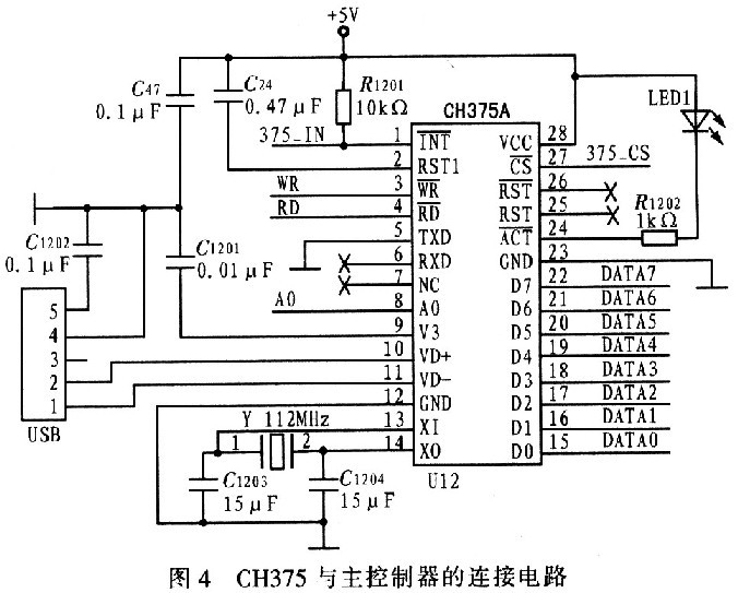 為便于儀器現場使用方便,該系統設計了對外信息輸送的USB接口,可使儀器便捷地與各類存儲器及電腦連接。其中,USB接口控制器采用CH357器件。CH357支持USB-HOST主機方式和USBDEVICE/SLAVE設備方式。在本地端CH375具有8位數據總線和讀、寫、片選控制線以及中斷輸出,可方便地掛接到ATxmegal28Al微控制器的系統總線上。圖4為CH375與主控制器的連接電路,CH375的TXD引腳直接接地,從而使CH375工作于并口方式。電容C1201用于CH375內部電源節點退耦,采用0.01μF的高頻瓷片電容,可提高接口的EMI要求。電容C47和C1202用于外部電源退耦,采用0.1μF的高頻瓷片電容。晶體X11、電容C1203和C1204用于CH375的時鐘振蕩電路。USB-HOST主機方式要求時鐘頻率比較準確,X11的頻率是12 MHz±0.4‰,C1203和C1204是容量約為15 pF的獨石電容。LEDl為數據傳送指示燈,用戶可以直觀觀察數據傳送狀態。