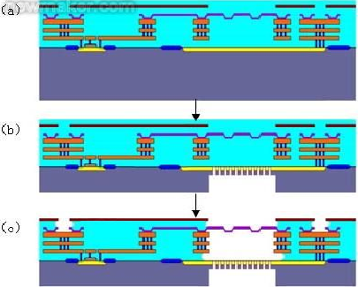 下圖簡述了Post-CMOS MEMS的制造方式。在Post-CMOS MEMS工藝中需特別注意,不能讓額外的熱處理或高溫工藝影響到CMOS組件的物理特性及MEMS的應力狀態,以免影響到振膜的初始應力。鑫創科技公司克服了諸多的技術難題,完全采用標準的CMOS工藝來同時制造電路元件及微機電麥克風結構。在CMOS部分完成后,將芯片的背面研磨至適當厚度以符合封裝要求。最后,利用氫氟酸溶液(HF)去除犧牲氧化物來釋放懸浮結構。此外,在設計中還需考慮可完全去除犧牲材料而又不損害麥克風振膜的蝕刻方法,并應避免麥克風振膜與背電極板之間產生粘黏現象。