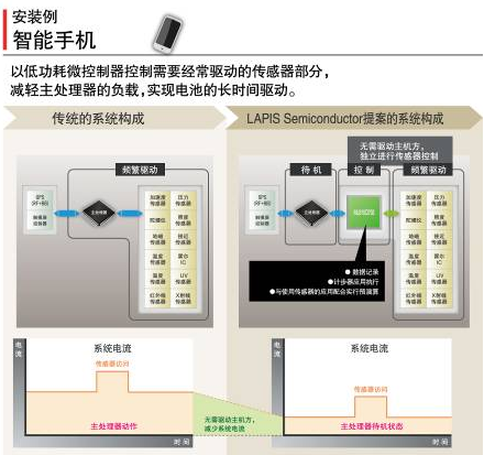 羅姆集團旗下的LAPIS Semiconductor面向智能手機市場開發出了可用更低耗電量綜合控制各種傳感器的、世界最小級別的低功耗微控制器“ML610Q792”。最近,在手機中智能手機所占的比率日益增加,而為了提供新的應用和服務不斷增加的傳感器群,導致智能手機的電池負載持續上升。LAPIS Semiconductor著眼于這種情況,將需要頻繁驅動的傳感器群從主處理器分離,通過低功耗微控制器進行控制,減輕了主處理器的負載,從而實現了電池的長時間驅動。另外,利用本微控制器的特點——即耗電量低的特性,通過與無線通信的組合,亦適用于傳感器網絡模塊等應用。