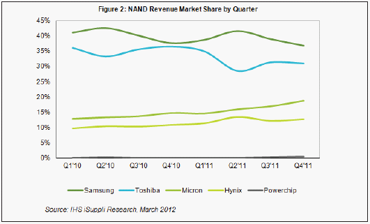 在材料方面,晶圓供應(yīng)商在一個月后就快速恢復(fù)了生產(chǎn),并提高了其它地點的產(chǎn)量,使其主要客戶面臨的供應(yīng)短缺問題降低最小。中期來看,這場災(zāi)害實際上導(dǎo)致NAND市場更加接近供需平衡,幫助該產(chǎn)業(yè)的營業(yè)收入在2011年第三季度環(huán)比增長10.0%,而2010年第三季度是環(huán)比增長9.1%。